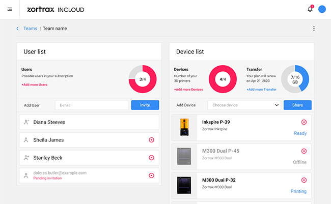 Zortrax inCloud is a cloud-based platform for efficient management of 3D printers and teamwork focused on model production. It’s available to everyone who has registered their Zortrax machines through the Zortrax ID system. The inCloud provides a variety of features which optimize the workflow with printers and teams of people involved in various 3D printing projects. Depending on the number of printers you or your team works with, you can choose a subscription plan that will be suited to specific needs and include a determined amount of transfer required for uploading files through the cloud service. Thanks to Zortrax inCloud, you can access and monitor all your Zortrax devices from any place you want.