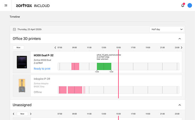 Timeline is a neatly organized activity log of all 3D printers added to your inCloud account. You can check when and for how long each of your printers worked, was paused, or was idle. It’s also possible to see all the models printed on your devices simply by scrolling through their respective timelines.